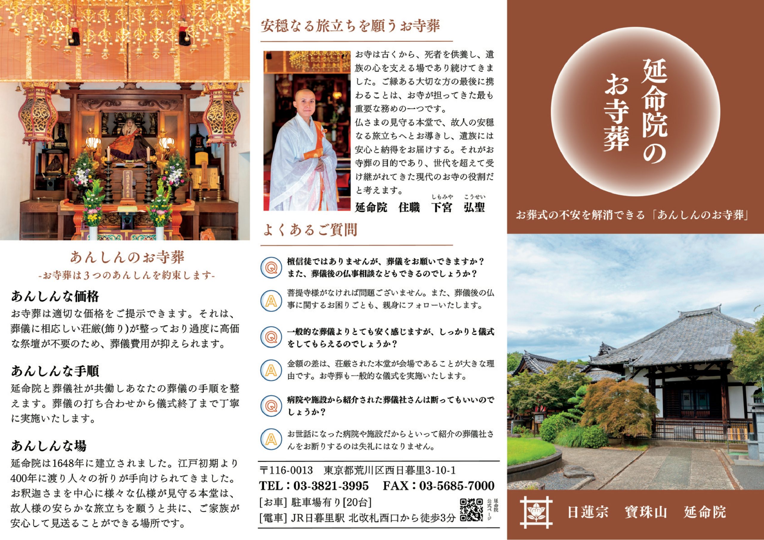 寺院名:延命院 所在地:〒116-0013 東京都荒川区西日暮里3-10-1(JR日暮里駅 北口徒歩3分) 電話(寺院):03-3821-3995 葬儀の受付:株式会社T-sousai ☎ 03-5356-1860(24時間365日対応)